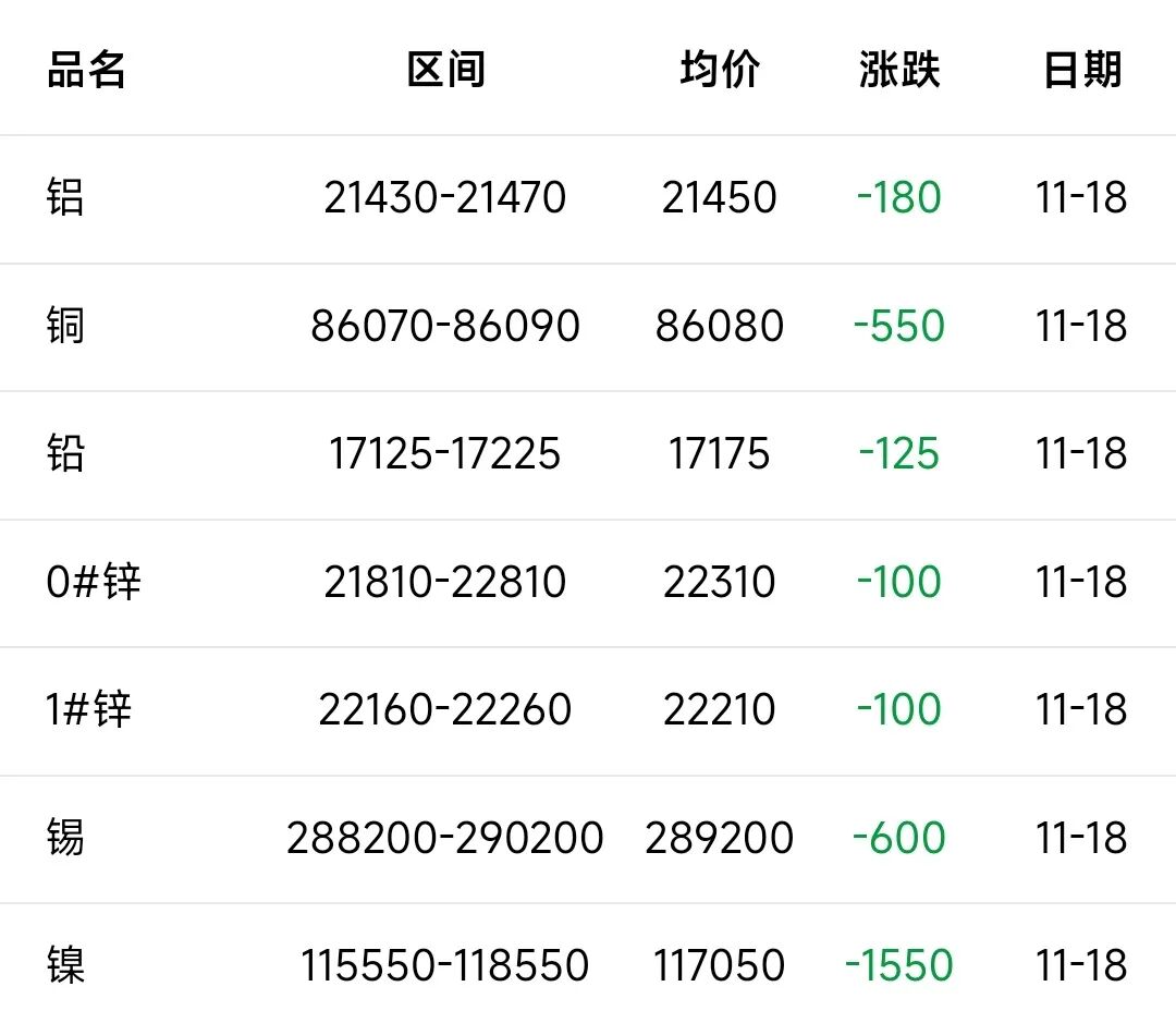 18日有色宝长江A00铝21430~21470均价21450跌180,前三日均价21827,前五日均价21754